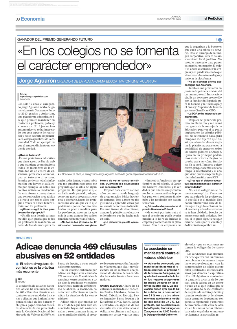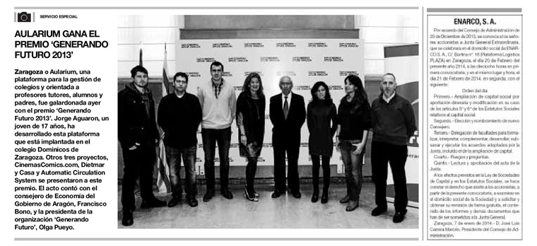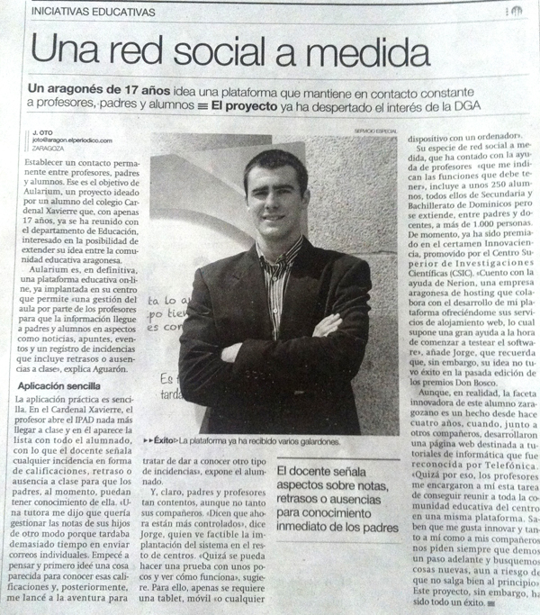 Nació el 16 de mayo de 1996. Es decir, todavía no es mayor de edad, pero ya ha demostrado que está llamado a hacer grandes cosas en el universo digital. El zaragozano Jorge Aguarón de Blas (@jorge_aguaron) ha ideado una innovadora plataforma on line llamada Aularium (@aularium) que de momento está implantada en el colegio Cardenal Xavierre (PP. Dominicos) de Zaragoza, pero que ya ha llamado la atención a los técnicos del departamento de Educación del Gobierno aragonés. Se trata de mantener en contacto constante a través de la red a profesores, padres y alumnos por el bien de la educación de estos últimos. Aularium, que ha sido premiado en el certamen Innovaciencia, promovido por el Centro Superior de Investigaciones Científicas, cuenta con la colaboración de nerion, ya que la plataforma está alojada en la infraestructura cloud de nuestra firma. A continuación, Jorge nos explica un poco más sobre su primer gran proyecto. Seguro que no será el último.